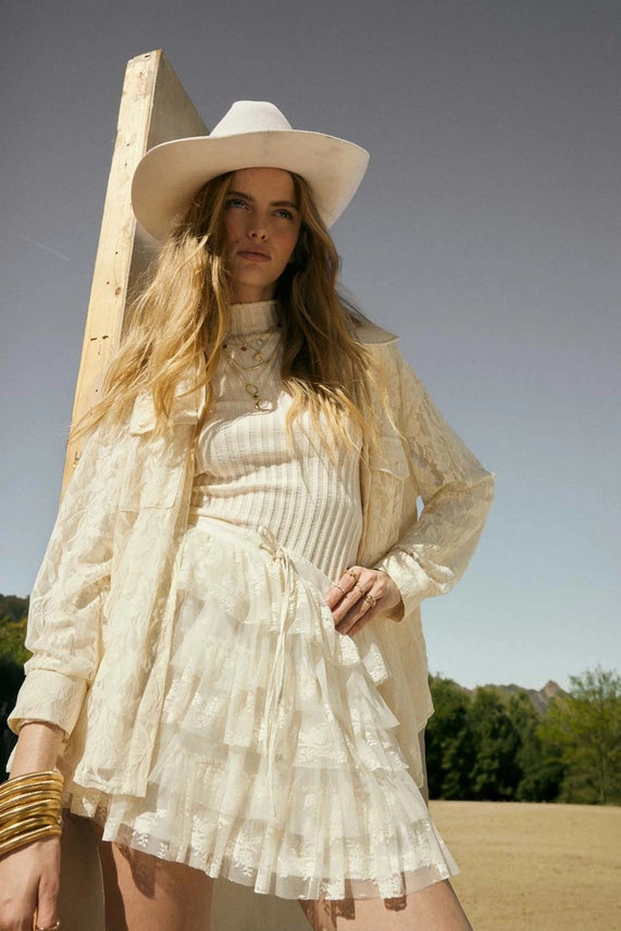 Lace and Tulle Tiered Ruffle Mini Skirt-Cream