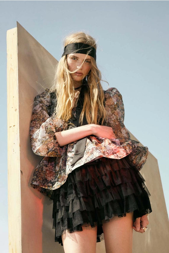Lace and Tulle Tiered Ruffle Mini Skirt-Black