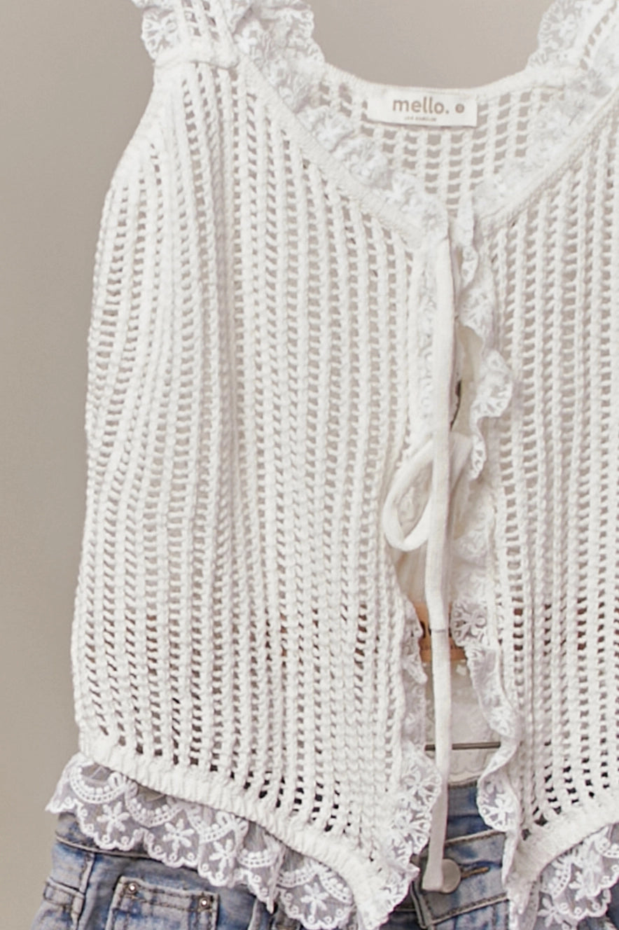 Why It’s a Best-Seller: 🧶Artisan Knit:Soft, open-work crochet texture that stays airy and cool. 🎀Tie-Front Detail:Adjustable front bows for a customizable, trend-forward fit. ☁️Delicate Lace:Dreamy scalloped lace trim and ruffles along the hem and neckline. 🎡Boho Versatility:Style it solo with denim cut-offs or layer it over a slip dress for a vintage vibe.